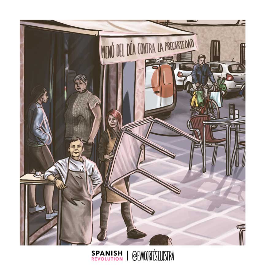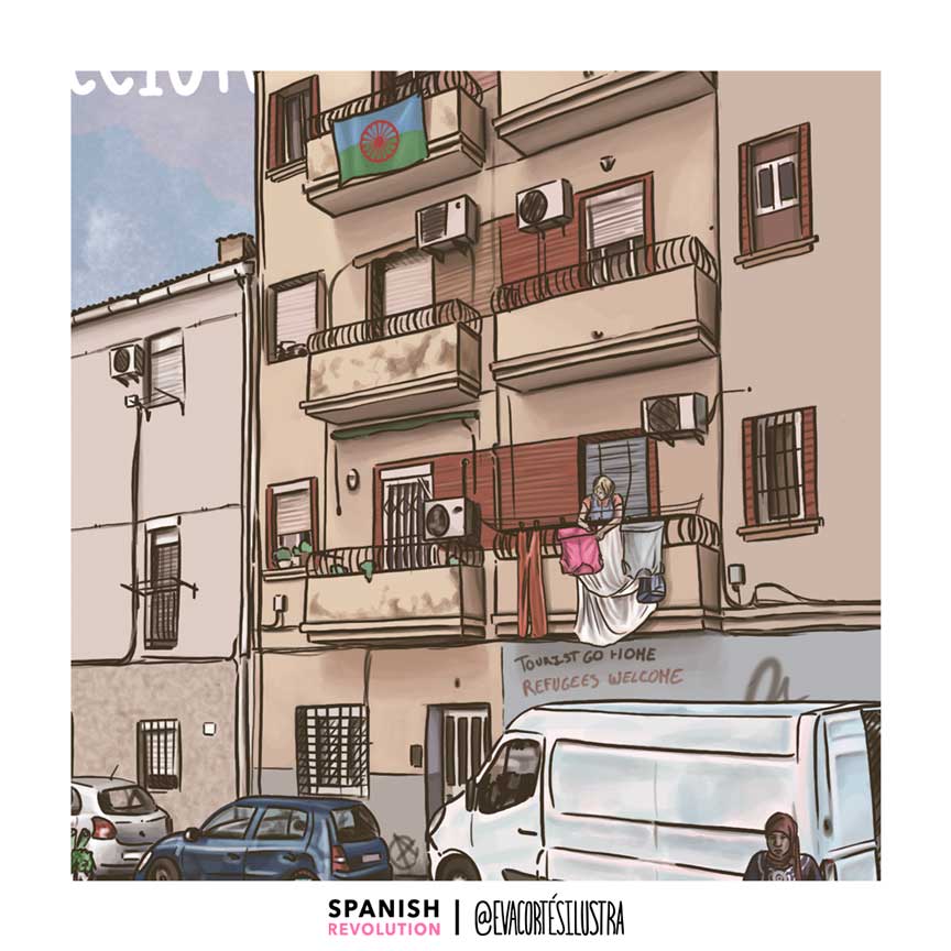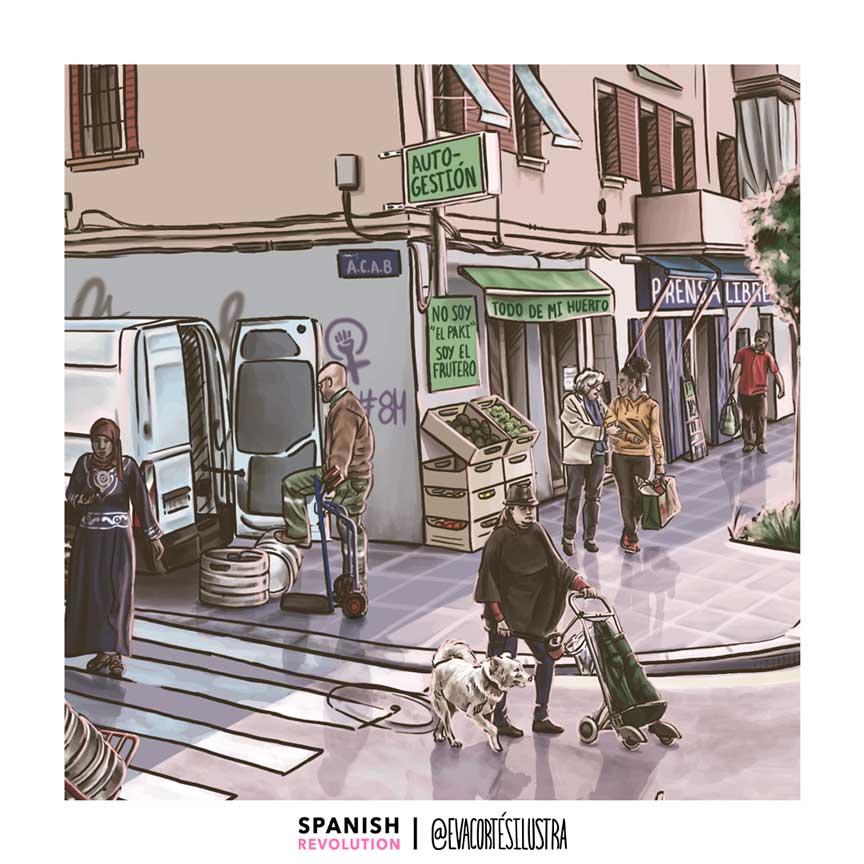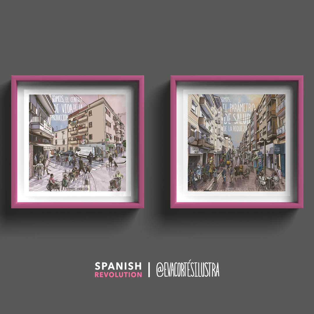 Barrios Obreros Spanish Revolution es un conjunto de láminas que retratan nuestra realidad. Porque querer mejorar la calidad de tu vida y la de tus vecinas, no quita de estar orgullosa de la clase social a la que perteneces. Seremos racializadas, migrantes, diversas en cuerpo y tono de piel, lesbianas, gays o trans, camareras, cuidadoras, obreras o con diversidades funcionales, y cada cual con una, dos, tres o catorce privilegios menos que la anterior. Pero que nos quiten lo bailado, seguiremos presionando mientras las esferas de arriba pretendan asfixiarnos por el bien capitalista y neoliberal. Gracias por apoyar a pequeñas autoras y a los medios libres, compañera.