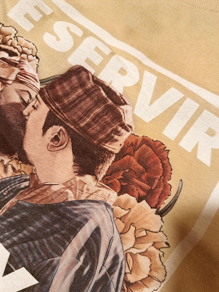 La camiseta con el diseño Usa tu lengua / Fe servir a tuya luenga, es un homenaje a la famosa foto de Pablo Ibáñez y hermana de un diseño dibujado por Eva Cortés conocido como “La jotera orinando” creado para el proyecto “O Zaguer Chilo V” de la Asociación Cultural Nogará-Religada. Dicha portada fue retirada por petición del partido político de ultraderecha (cuyo nombre no vamos a nombrar), porque era “ofensiva” en una imagen de un proyecto vinculado al Ayuntamiento de Zaragoza. Es entonces, cuando el gobierno del PP aceptó la petición de retirada haciendo una actuación digna de censura.